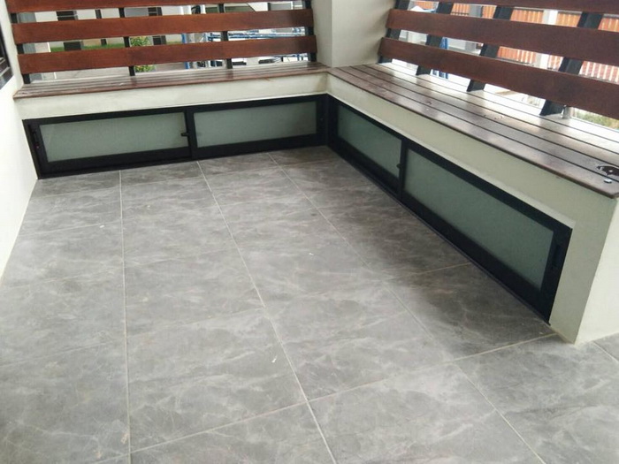 พื้นเฉลียงปูด้วยกระเบื้องโทนสีเทาลวดลายธรรมชาติ บริเวณใต้ที่นั่งพนักพิงยังออกแบบให้มีช่องสำหรับเก็บของด้านล่าง เป็นการใช้ประโยชน์พื้นที่ได้อย่างคุ้มค่า